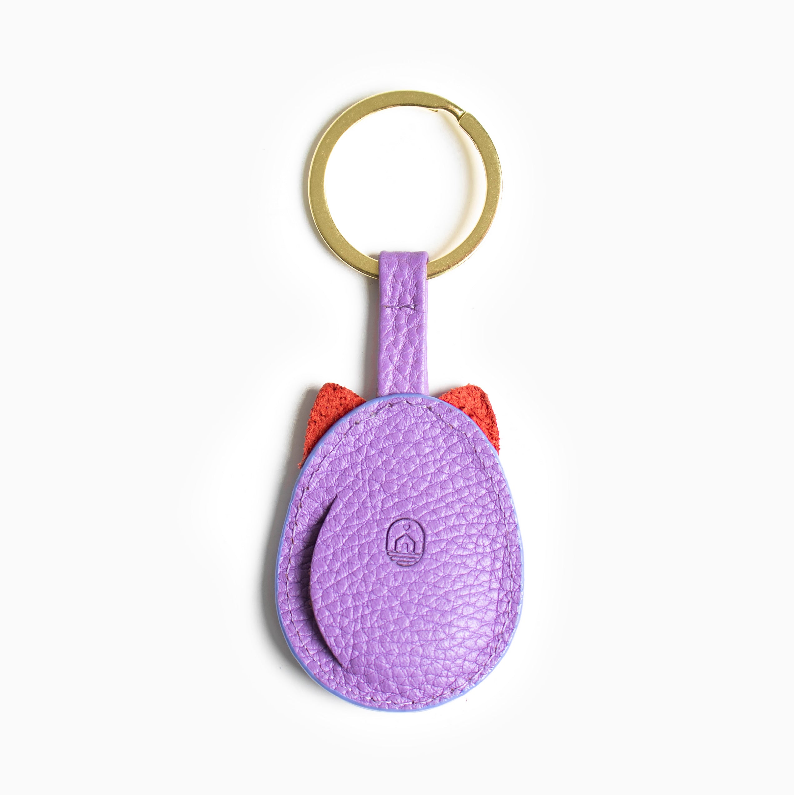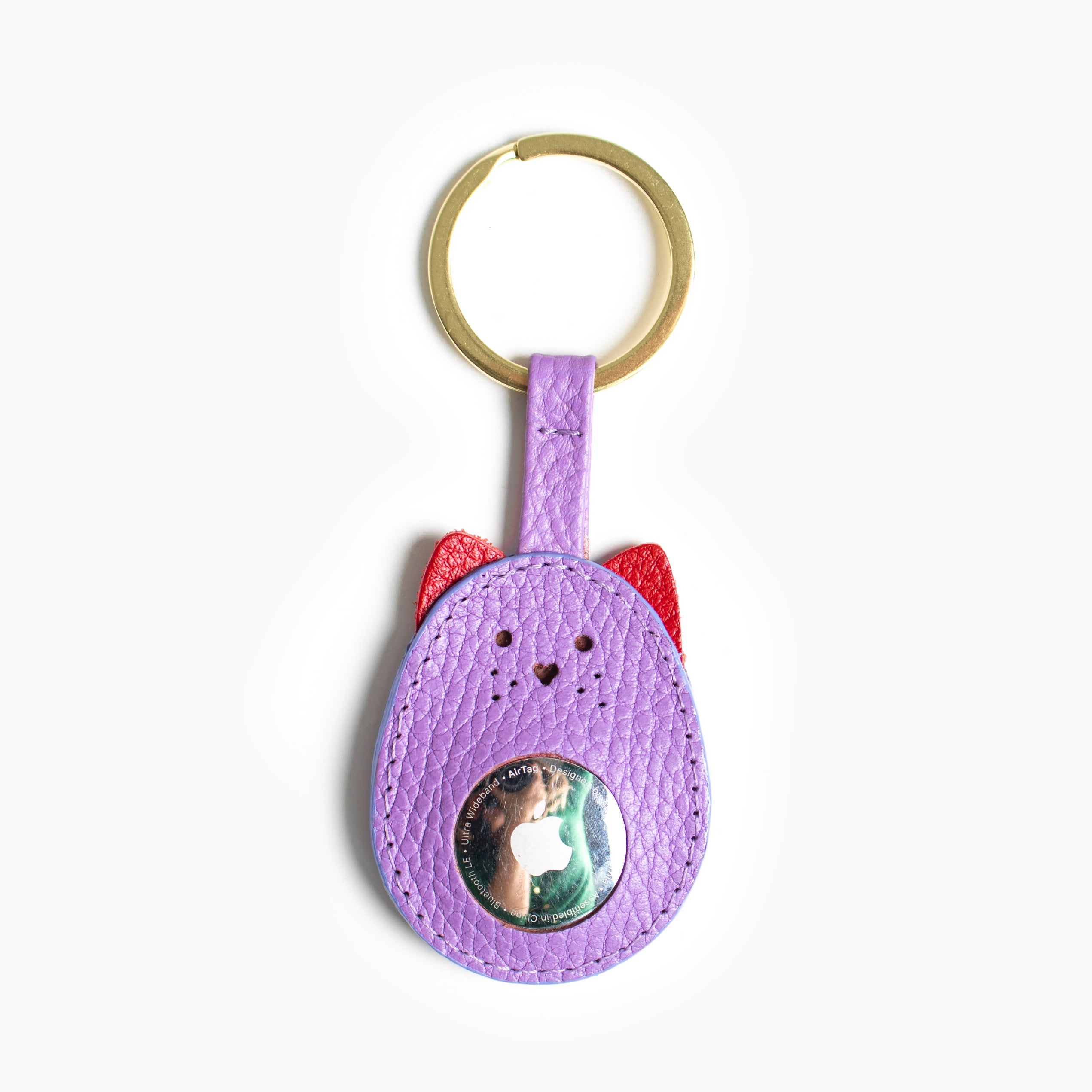 A vibrant lilac and red leather cat key holder created to bring character and protection to your Apple AirTag. Compact, lightweight, and secure.
